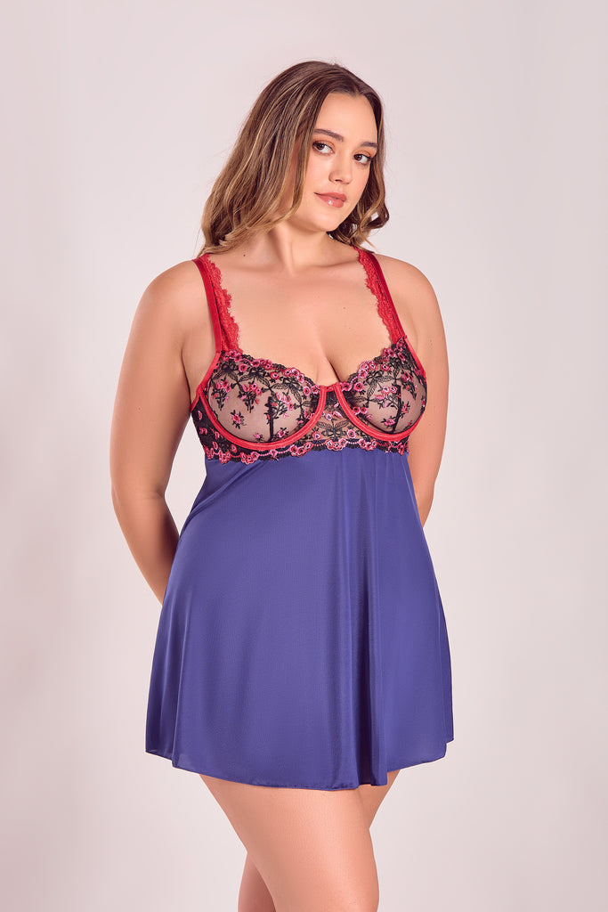 Cross dyed galloon lace and jacquard mesh babydoll with underwire, adjustable shoulder straps, hook and eye back closure, and matching mesh g-string.